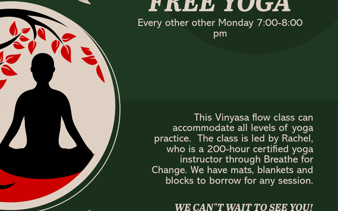 The class is led by Rachel, who is a 200-hour certified yoga instructor through Breathe for Change. We have mats, blankets and blocks that you can borrow for any session.